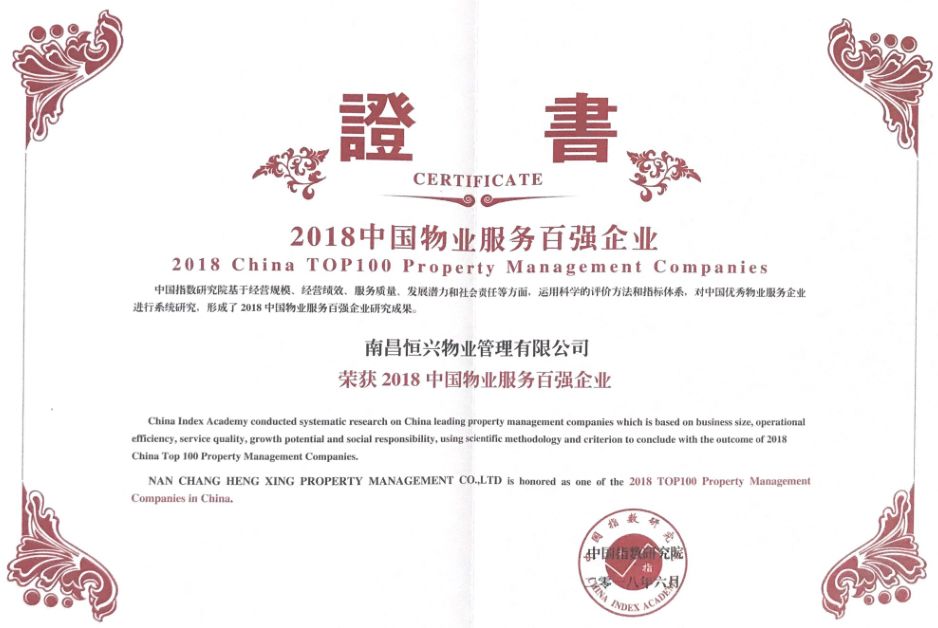 2018中国物业服务百强企业荣誉证书